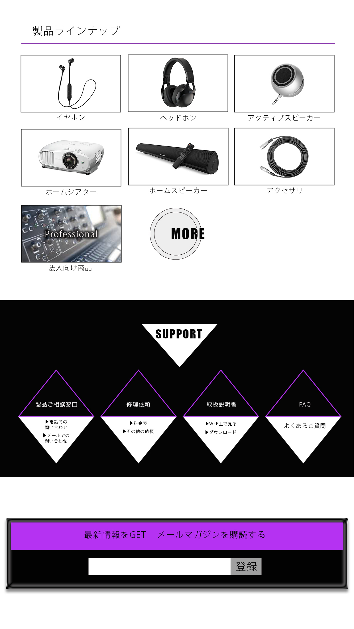 ブランドイメージとしては、JBLやSHUREのようなスポーティでエッジの効いたシンプルな商品デザインに合うような、黒、白、紫を使用しました。
