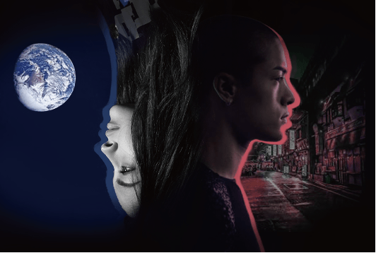 4枚の画像を使用し、対局になるよう描きました。人物の背景に、風景と同じ色の影をいれることで神秘的なイメージに。人物同士が重なる部分が不自然にならないようにぼかしました。